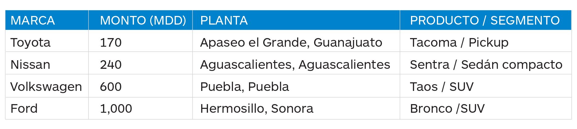 Las reinversiones hechas recientemente en México por estas cuatro armadoras suman más de 2,000 millones de dólares, el equivalente a la construcción de dos fábricas OEMs.