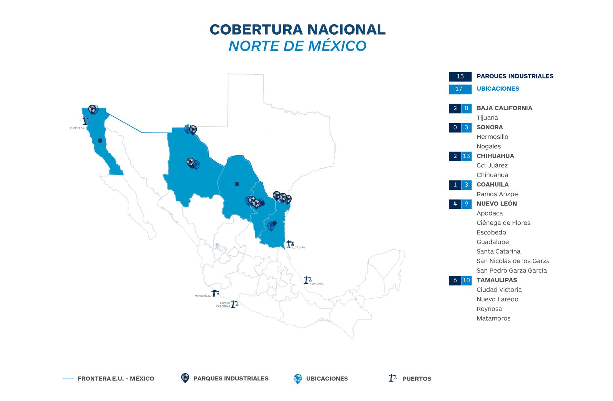 Haz click aquí para conocer nuestros 15 parques industriales en la frontera de México con Estados Unidos, o aquí para conocer nuestras propiedades industriales disponibles alrededor del país.