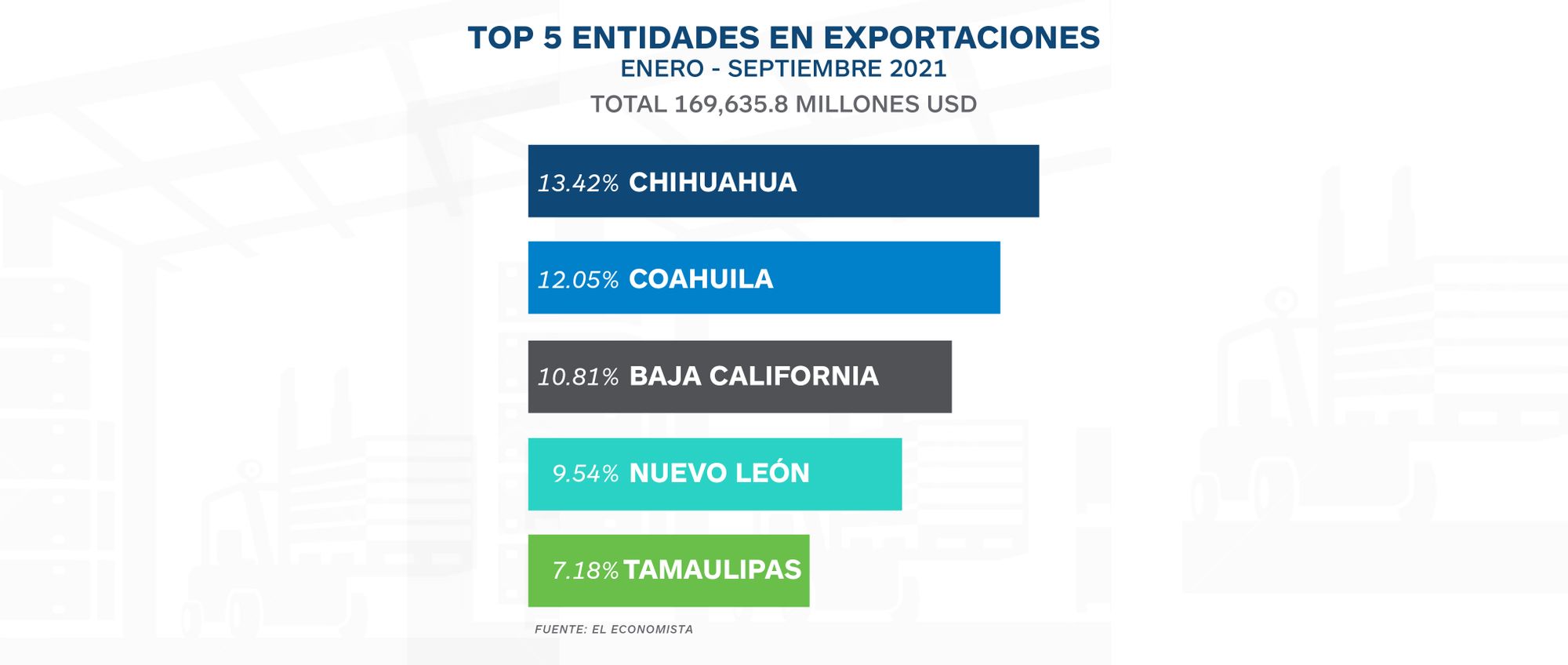 Cinco entidades del norte del país concentran el 52.9% del valor total nacional de las exportaciones (cifra que equivale a 320,081.8 millones de dólares). Se trata de Chihuahua, Coahuila, Baja California, Nuevo León y Tamaulipas; estas sumaron un valor de 169,635.8 millones de dólares, de enero a septiembre del 2021.